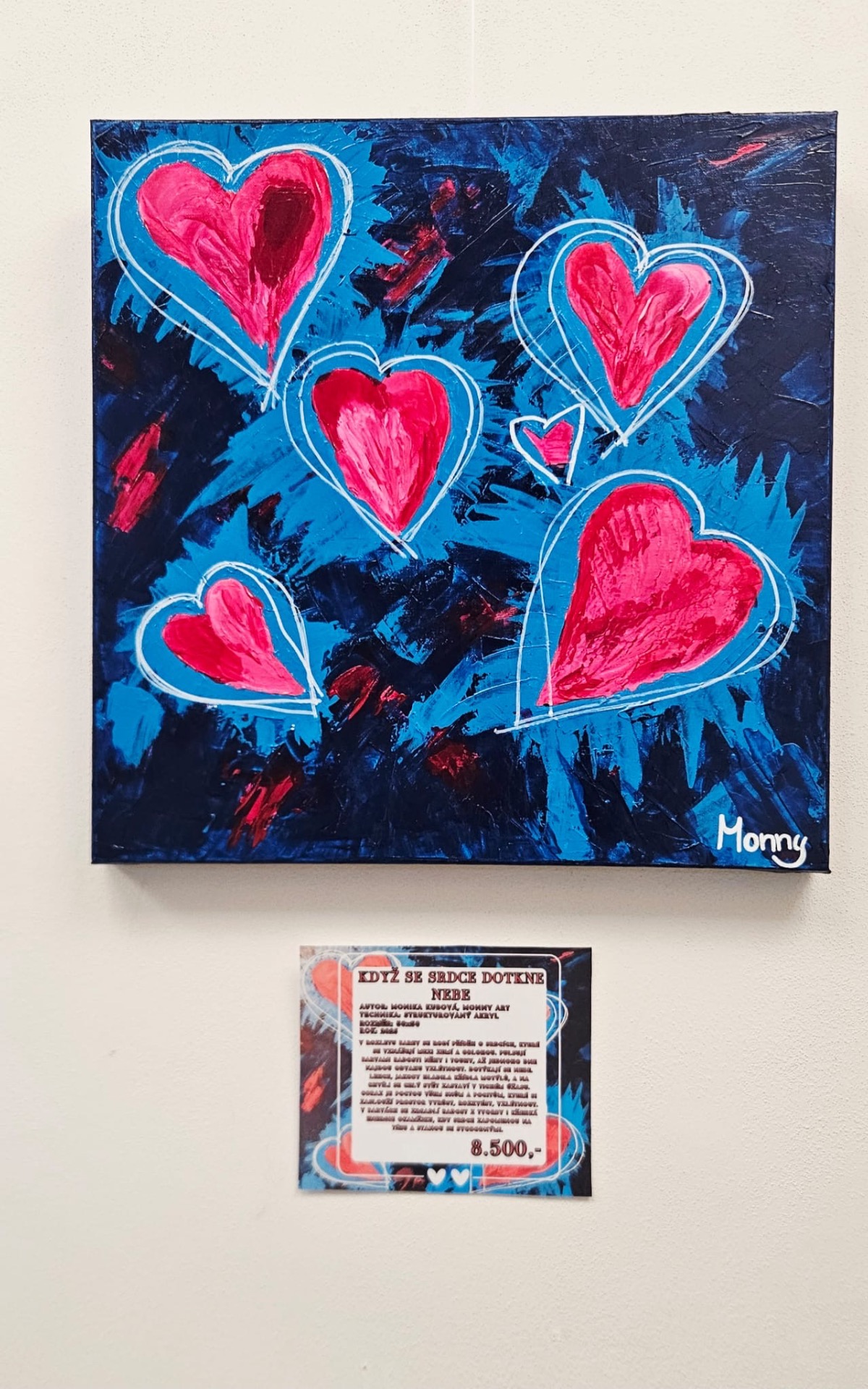 V rozletu barev se rodí příběh o srdcích, které se vznášejí mezi zemí a oblohou. Pulsují barvami radosti, něhy i touhy, až jednoho dne najdou odvahu vzlétnout. Dotýkají se nebe. Lehce, jakoby hladila křídla motýlů, a na chvíli se celý svět zastaví v tichém úžasu. Obraz je poctou všem snům a pocitům, které si zaslouží prostor vyrůst, rozkvést, vzlétnout. v barvách se zrcadlí radost z tvorby i křehká energie okamžiku, kdy srdce zapomenou na tíhu a stanou se svobodnými.