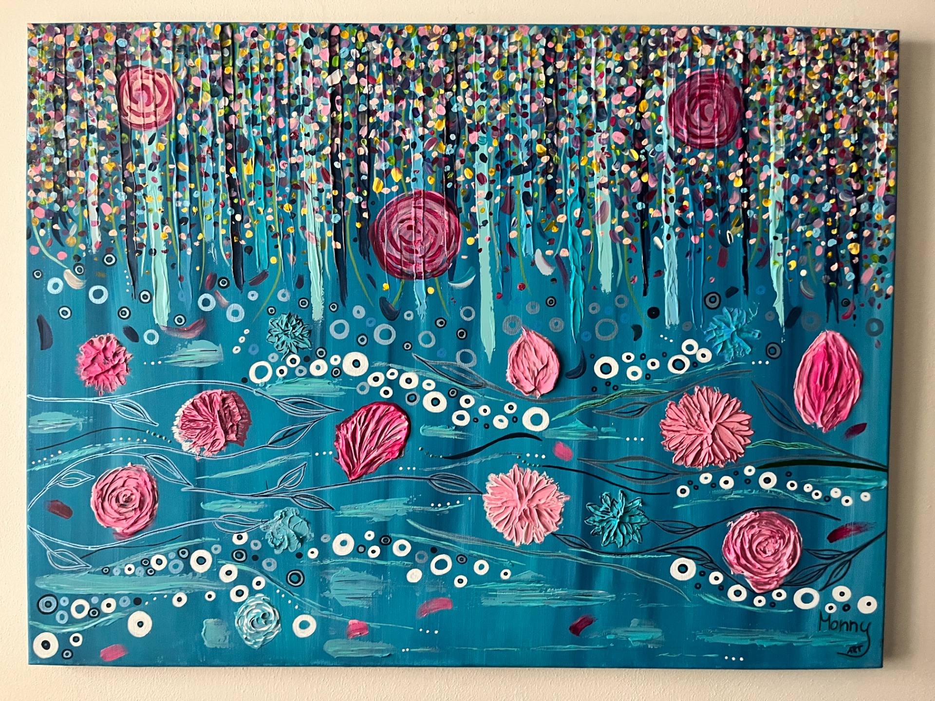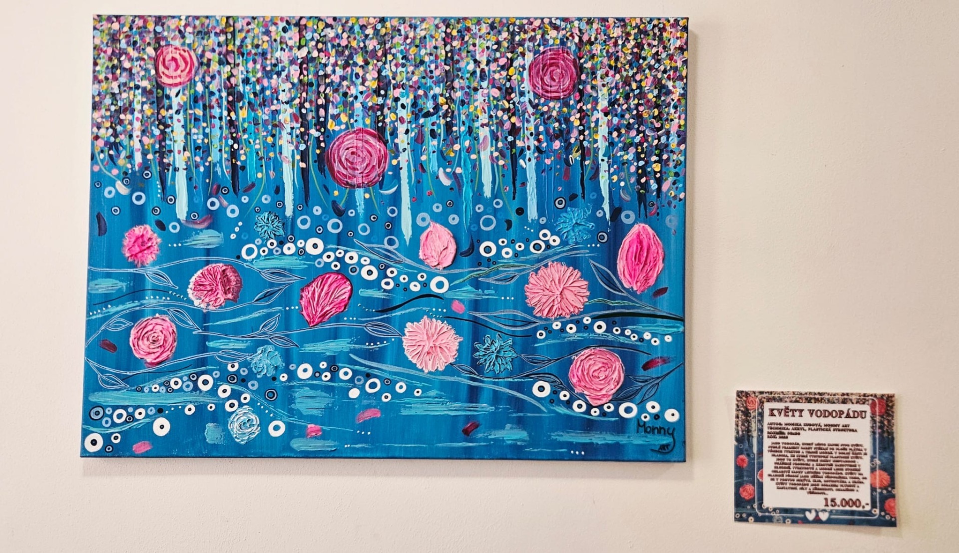 Jako vodopád, který místo kapek sype květy. Svislé prameny barev stékají po ploše plátna v tónech tyrkysu a temné modré. Zatímco v dolní části je hladina, ze které vystupují plastické květy. Jsou to květy, které nikdy neuvadnou. Unášené proudem a zároveň zakotvené v hlubině. Tyrkysové a modré linie evokují chladivé kapky letního vodopádu, zatímco květy na hladině působí jako něžná připomínka toho, co se v pohybu skrývá. Klid, rovnováha a krása. Květy vodopádu jsou obrazem plynutí, zastavení, síly a křehkosti, okamžiku a věčnosti.