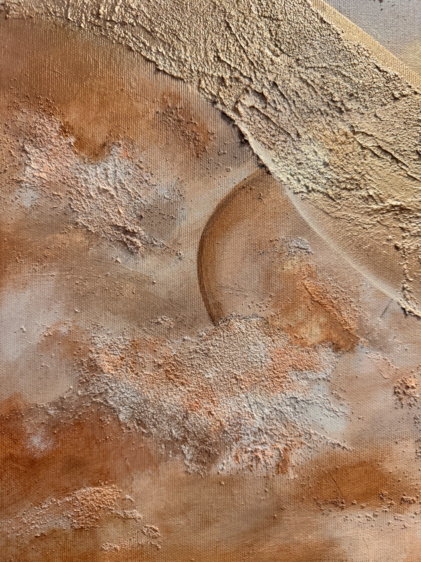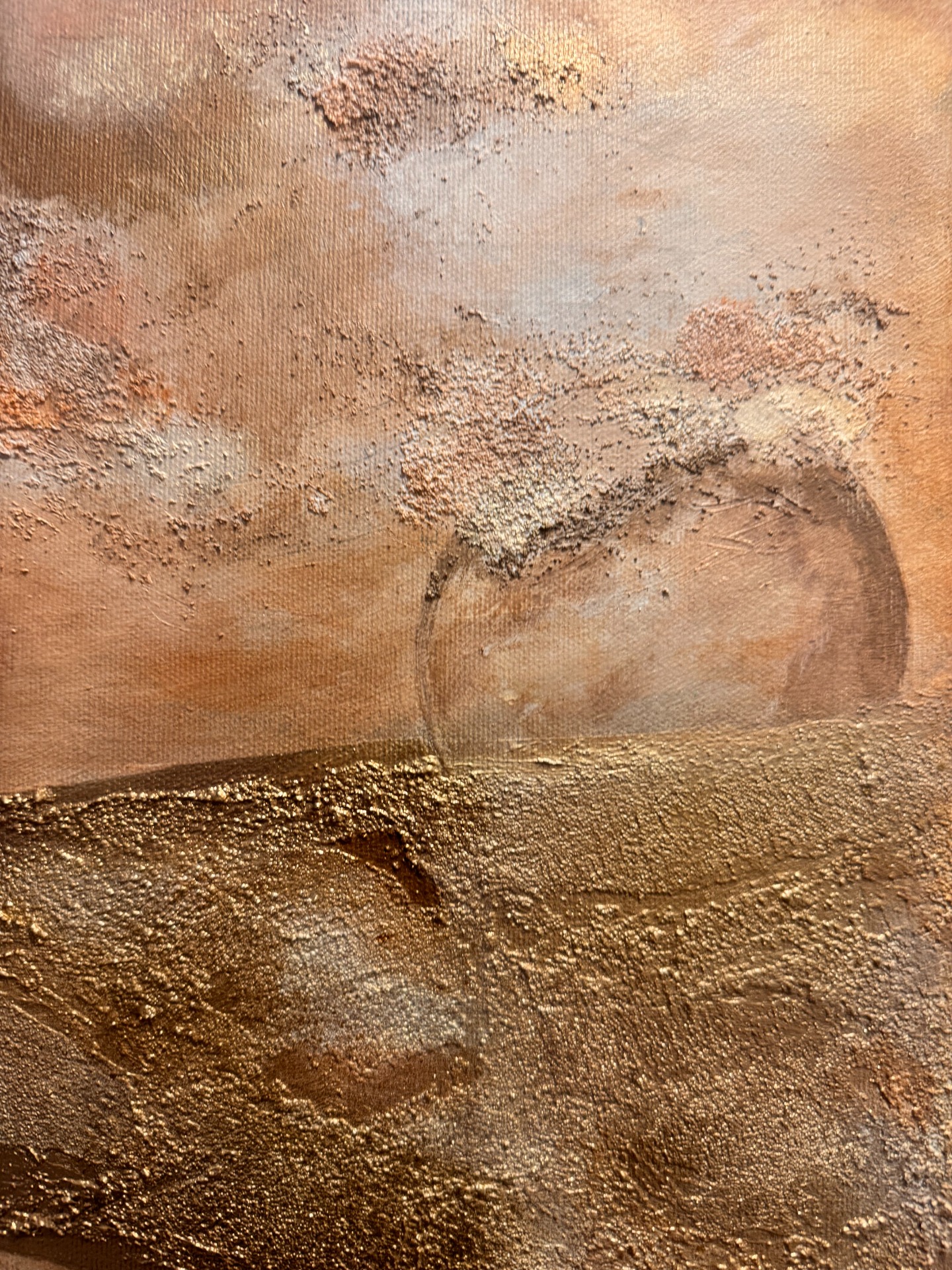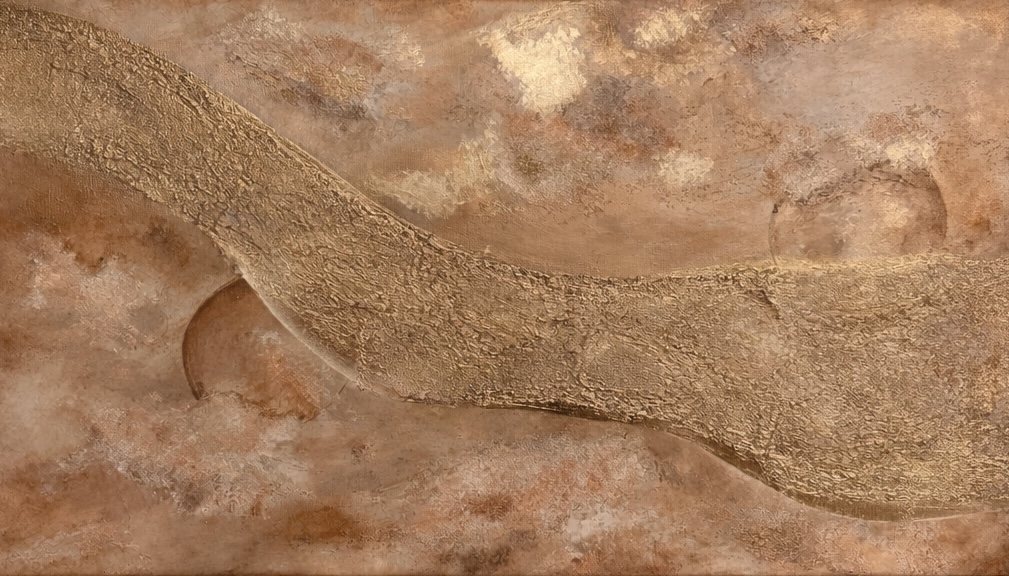 Dominantní zlatavá linie prochází krajinou struktury jako klidná, pevná dráha. Není křehká. Je ukotvená. Vede napříč proměnlivým podkladem teplých zemitých tónů, které evokují písek, hlínu, prach i čas. Povrch je vrstvený, místy surový, místy jemně rozostřený – stejně jako skutečné životní etapy.