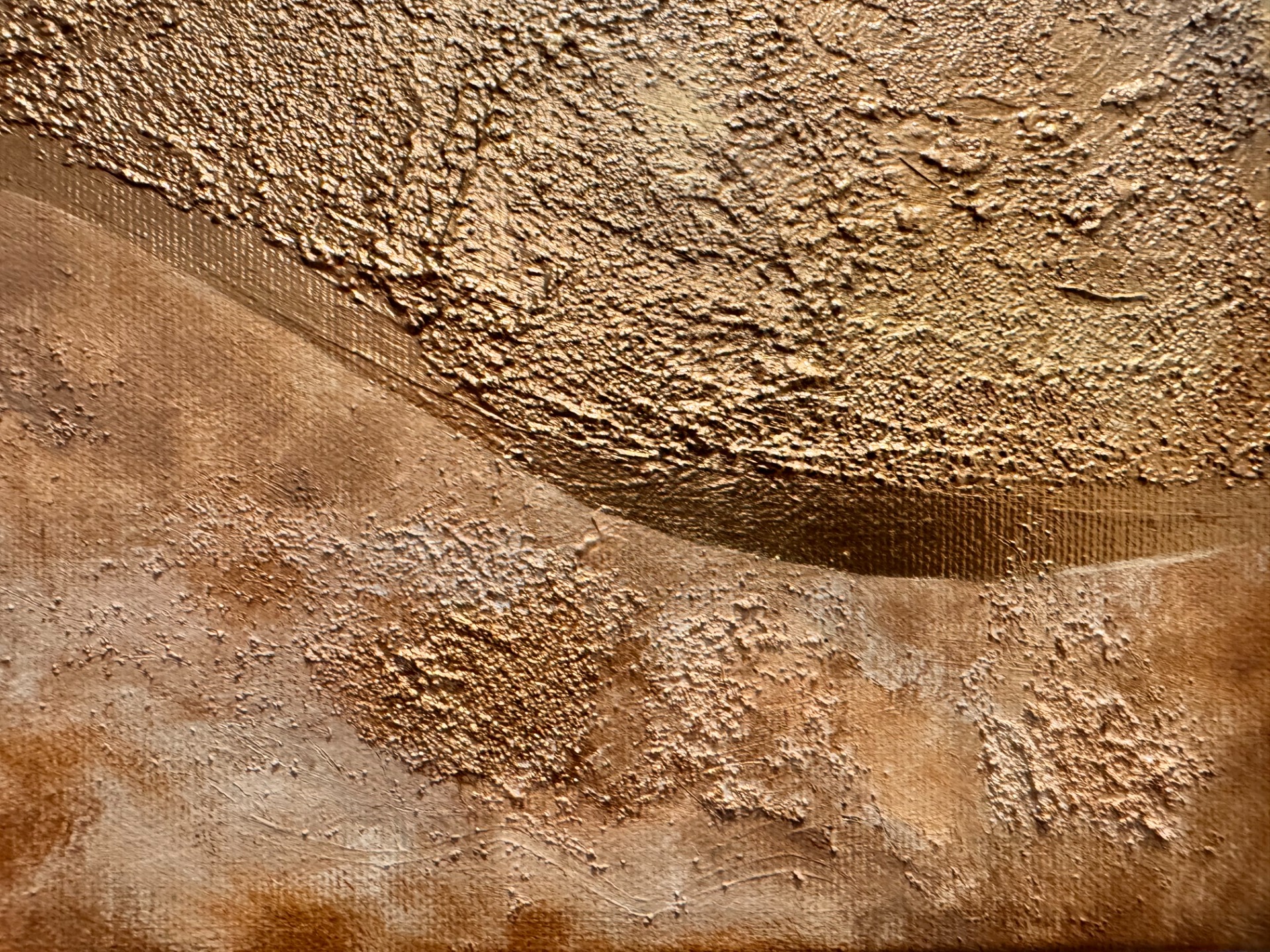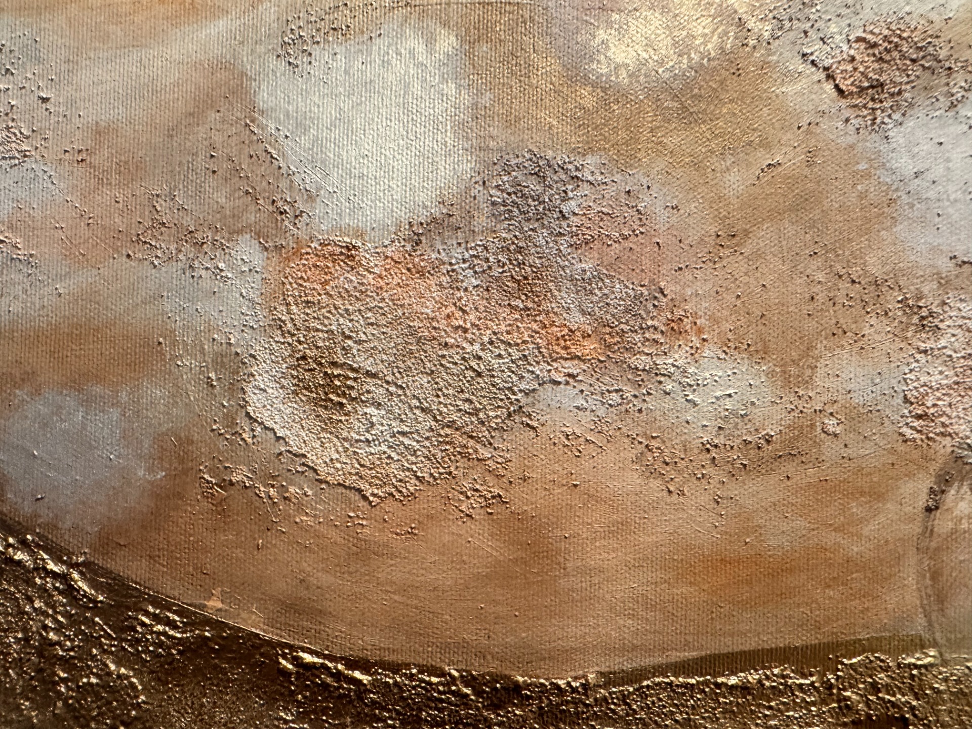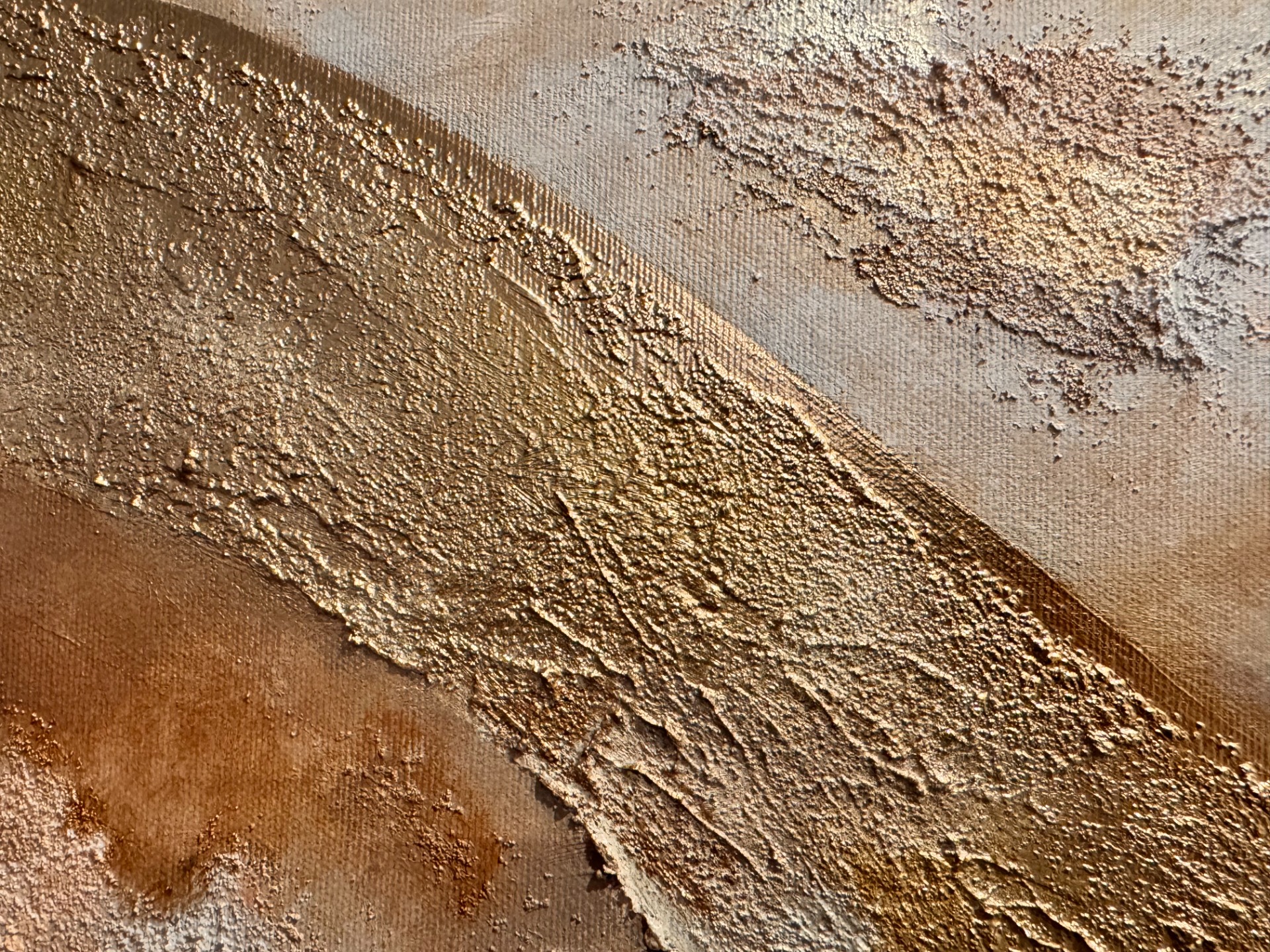 Dominantní zlatavá linie prochází krajinou struktury jako klidná, pevná dráha. Není křehká. Je ukotvená. Vede napříč proměnlivým podkladem teplých zemitých tónů, které evokují písek, hlínu, prach i čas. Povrch je vrstvený, místy surový, místy jemně rozostřený – stejně jako skutečné životní etapy.