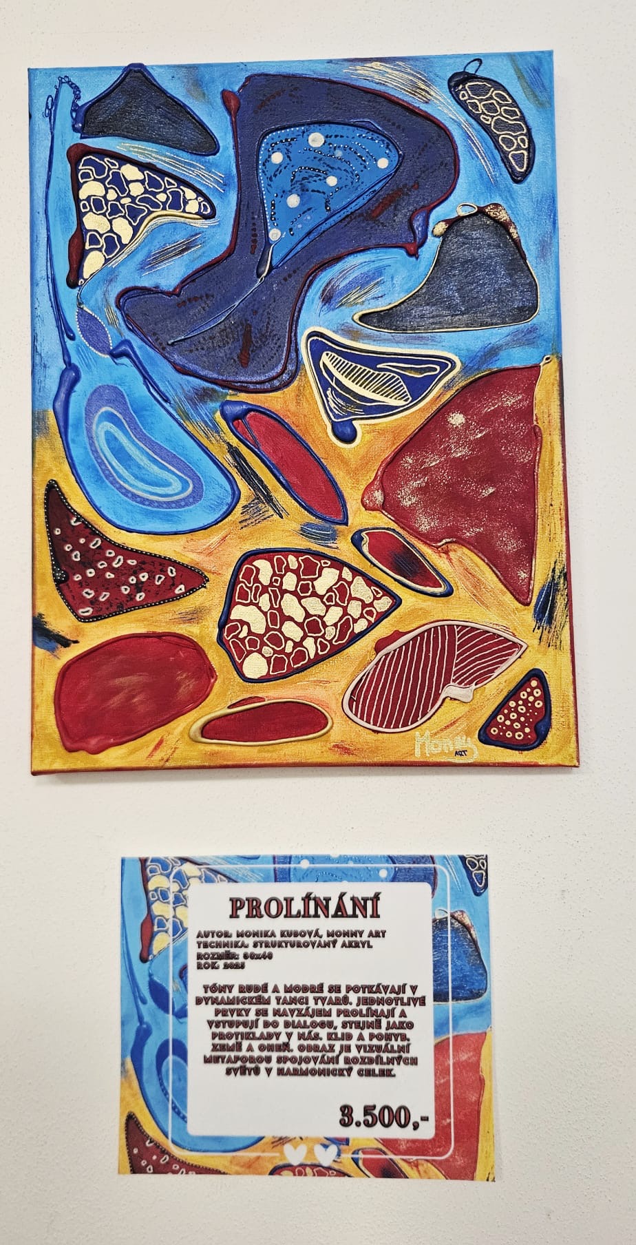 Tóny rudé a modré se potkávají v dynamickém tanci tvarů. Jednotlivé prvky se navzájem prolínají a vstupují do dialogu, stejně jako protiklady v nás. Klid a pohyb. Země a oheň. Obraz je vizuální metaforou spojování rozdílných světů v harmonický celek.