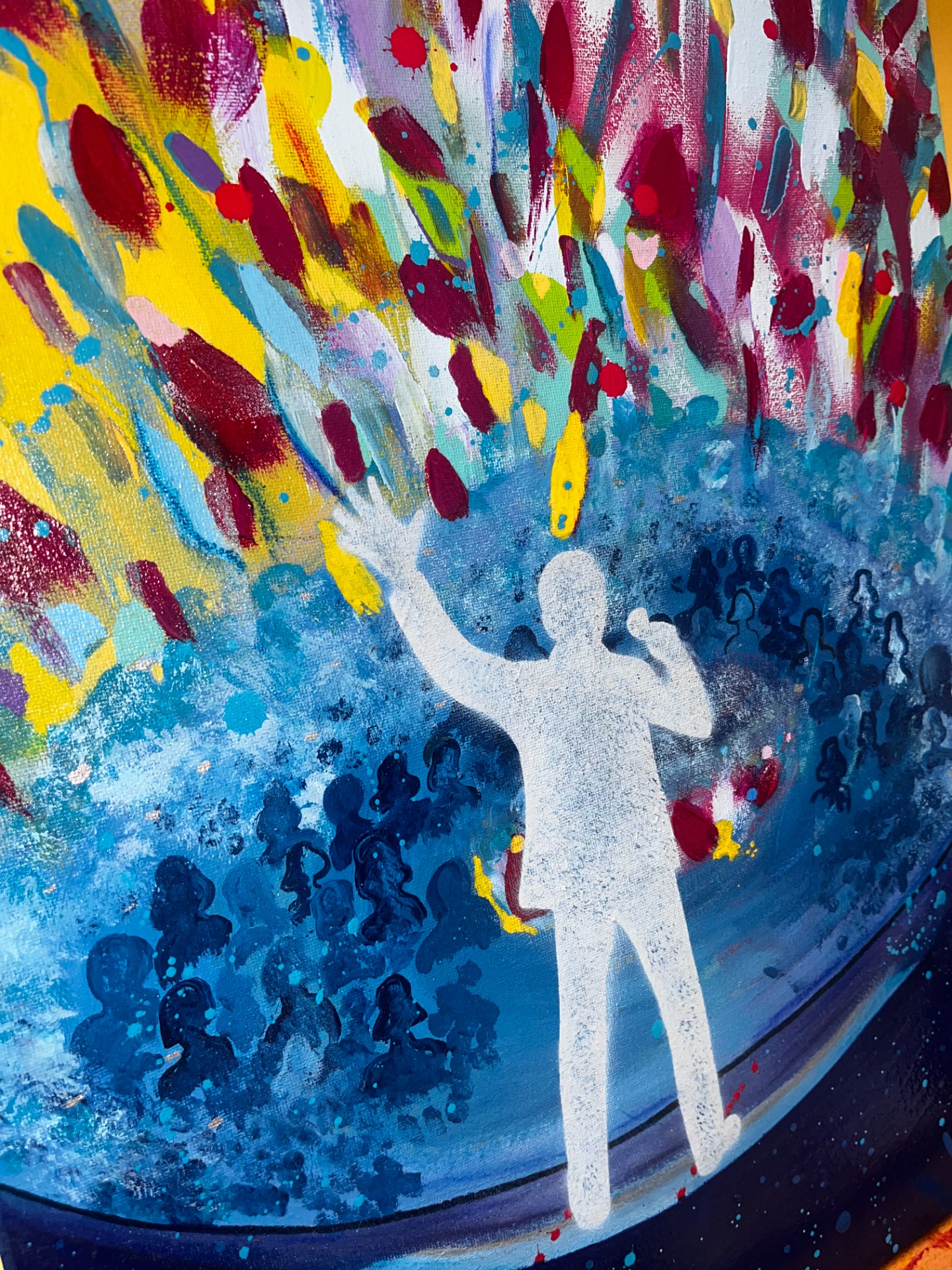Obraz symbolizuje sílu okamžiku, kdy se energie světel, hudby a lidí propojuje do jedné oslavy života. Dílo je věnováno muži, který sám stojí často ,,V ZÁŘI REFLEKTORŮ" a pomáhá vytvářet nezapomenutelné zážitky druhým.