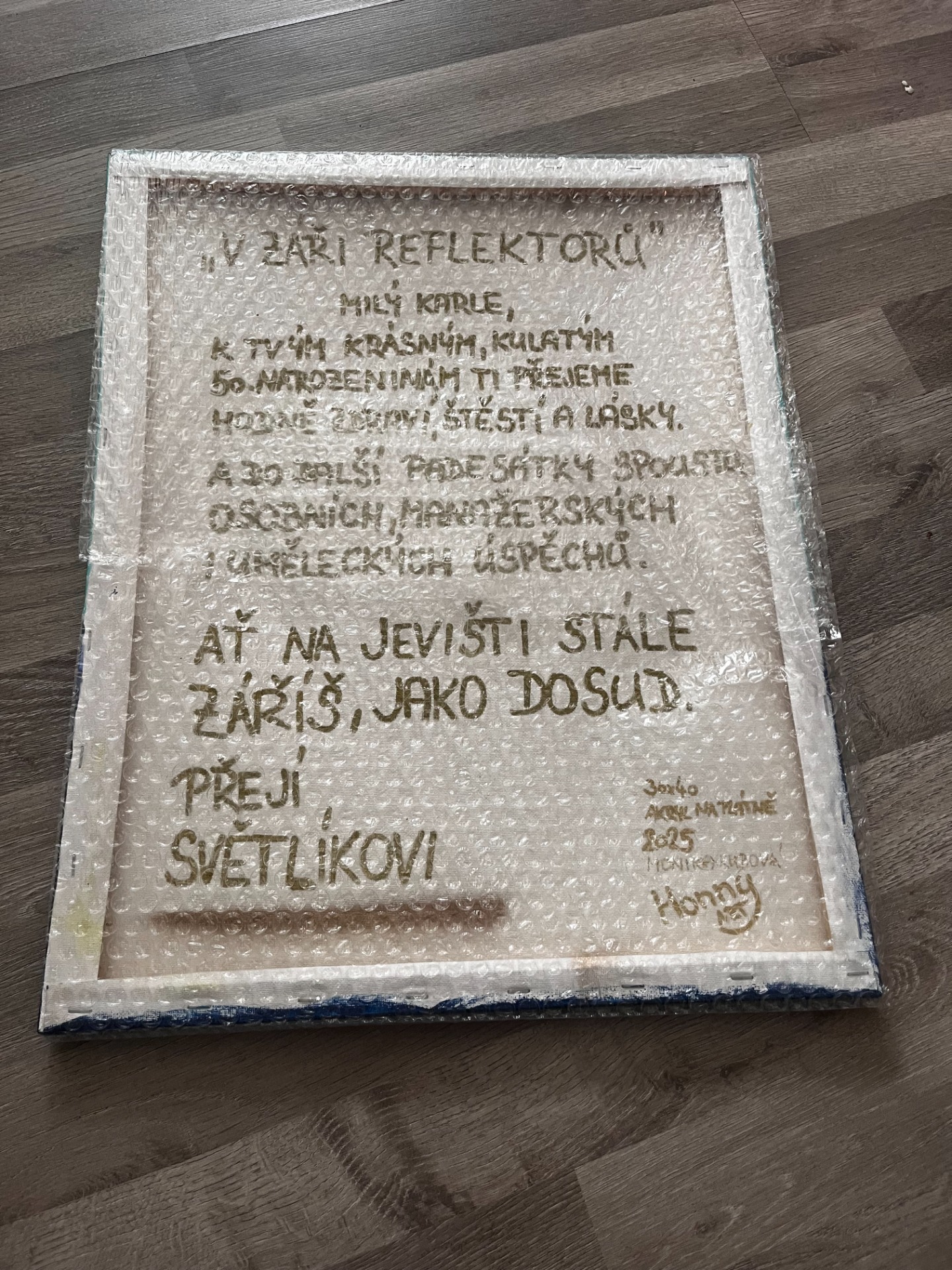 Obraz nese nejen autorský rukopis, ale i skryté poselství a osobní věnování přímo na zadní straně plátna.