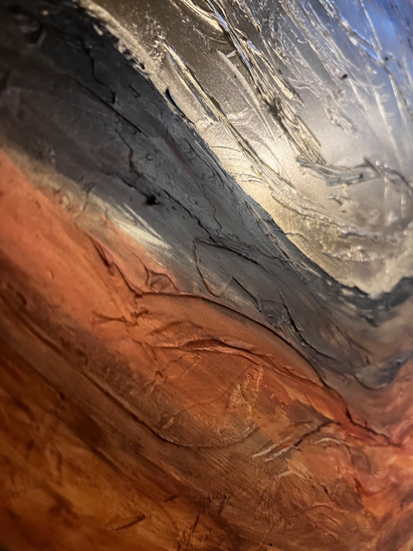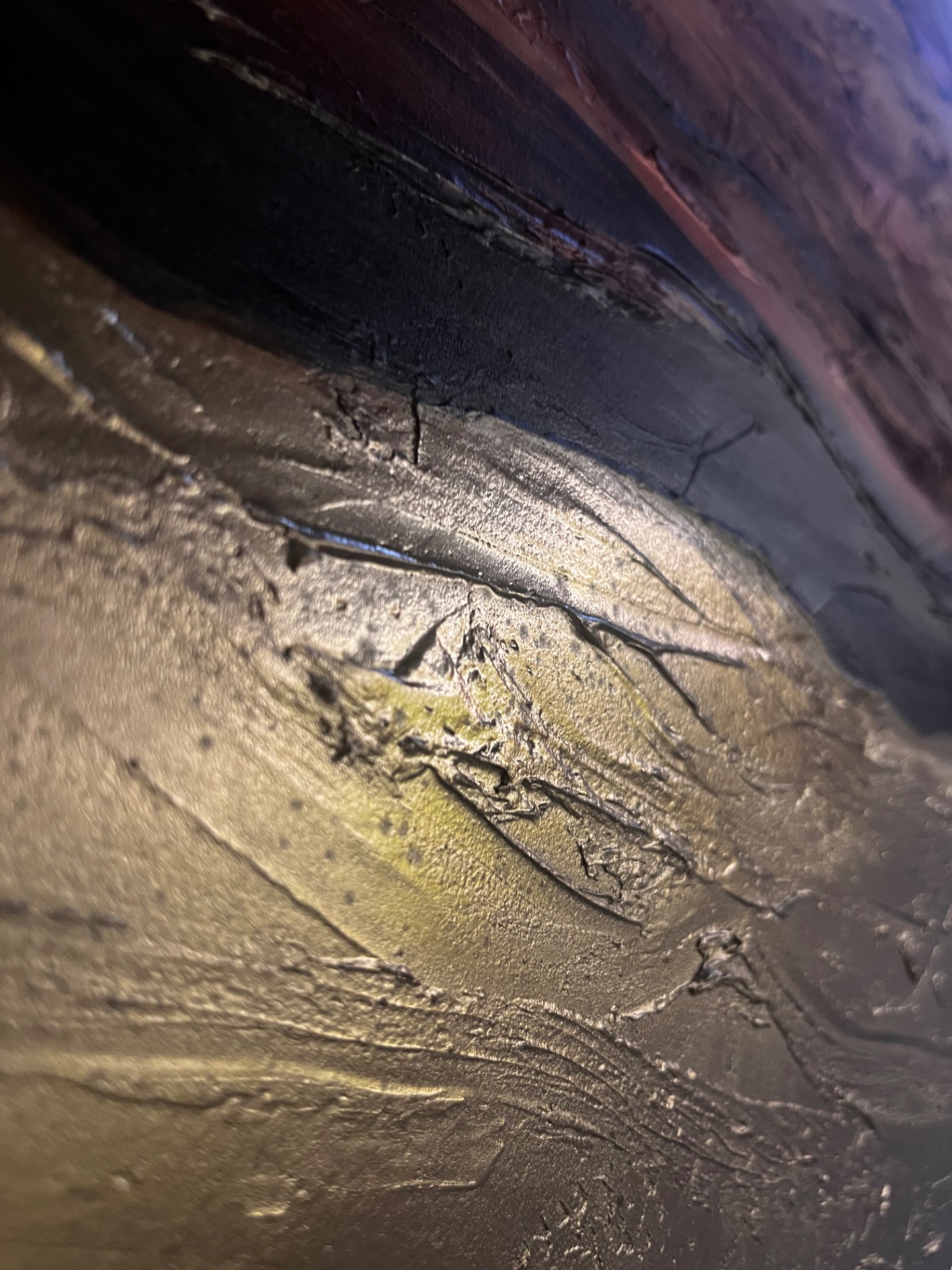Dominantní světlá linie uprostřed obrazu působí jako zlom i spojnice – světlo, které si razí cestu skrze hmotu. Struktura není dekorativní, ale fyzicky přítomná: zachycuje gesto, tlak i čas, který byl do obrazu vložen. Při dopadu světla se povrch proměňuje a obraz reaguje na prostor i denní dobu.