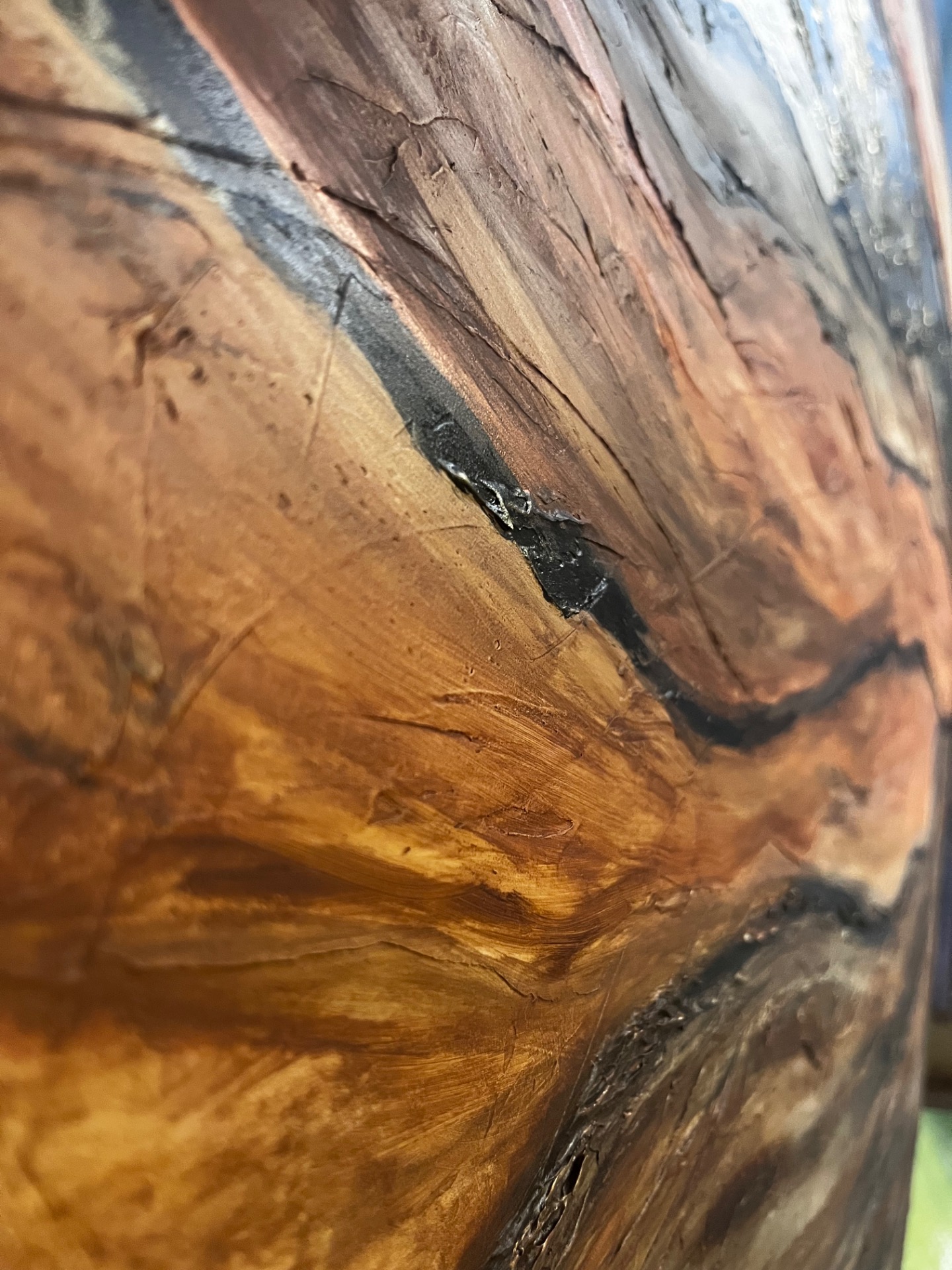 Obraz VRSTVY ŽIVOTA pracuje s hlubokou vrstevnatostí a přirozeným tokem barev, které připomínají geologické vrstvy krajiny nebo proudění energie v čase. Teplé odstíny hnědé, rezavé, zlaté a tmavých akcentů se prolínají v plynulém pohybu napříč plátnem a vytvářejí pocit kontinuity, síly a vnitřního klidu zároveň.